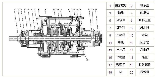 GC型水泵的主要零件有軸、軸套、進水段、葉輪、導(dǎo)翼、密封環(huán)、中段、出水段、平衡環(huán)、平衡盤、尾蓋。