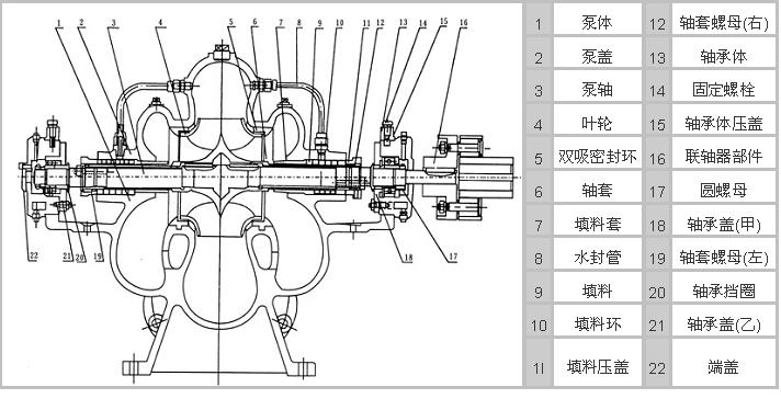 SH型單級雙吸中開離心泵是新型節(jié)能臥式中開泵,主要由泵體、泵蓋、軸、葉輪、密封環(huán)、軸套、軸承部件等組成,其吸入口和排出口均在水泵軸心線下方,檢修時,只要將泵蓋揭開,即可將全部零件拆下進行維修。供輸送清水或物理化學(xué)性質(zhì)類似水的其它液體,根據(jù)用戶需求,通過改變泵結(jié)構(gòu)及材質(zhì)可用于輸送多泥沙水或各類腐蝕性液體。其性能符合JB/1050-93《單吸雙吸清水離心泵型式與基本參數(shù)》標準。